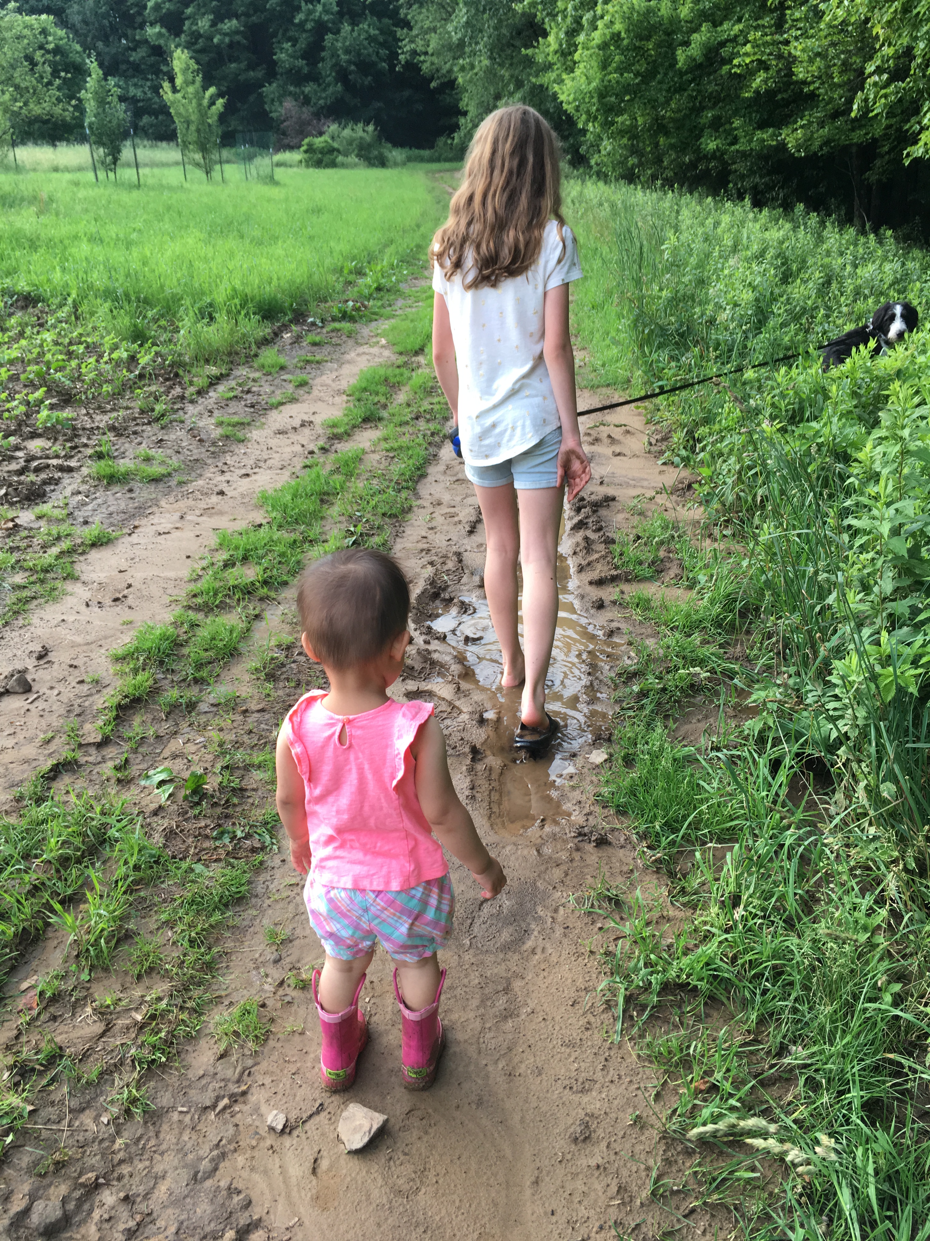 So, we usually take a walk every day. One day we were following Tucker on a trail around the field. It had rained the day before and there were some puddles on the path.
