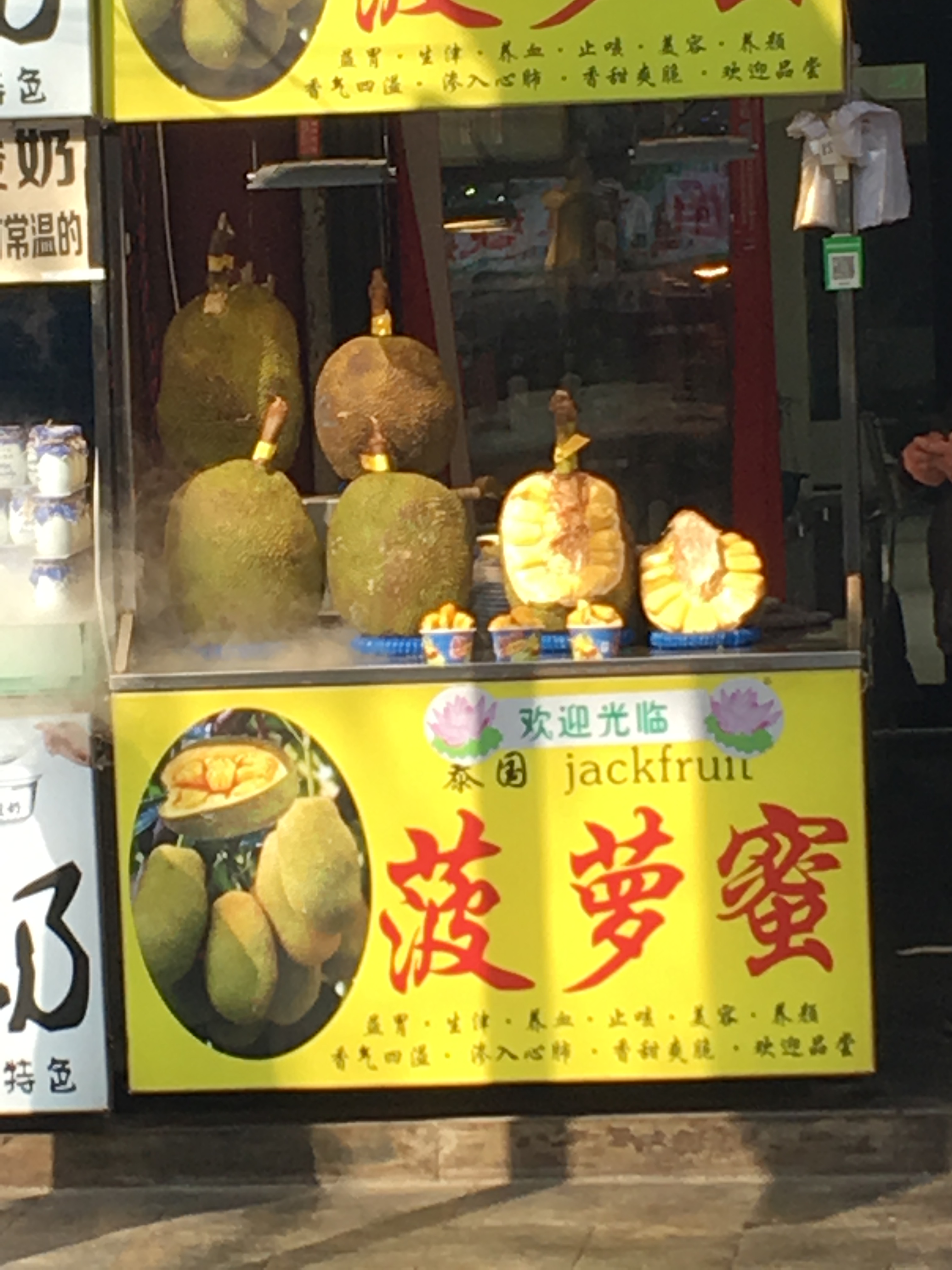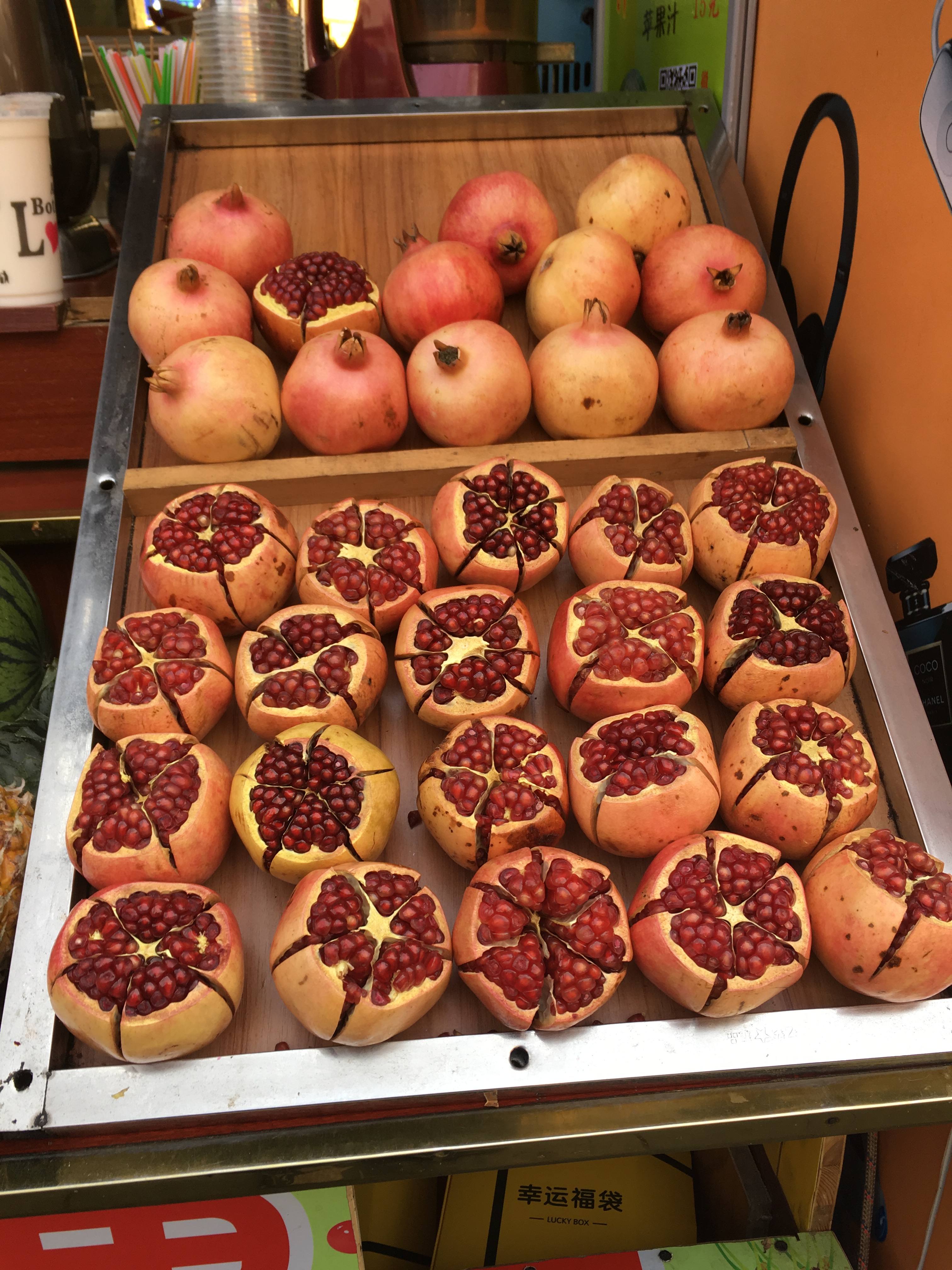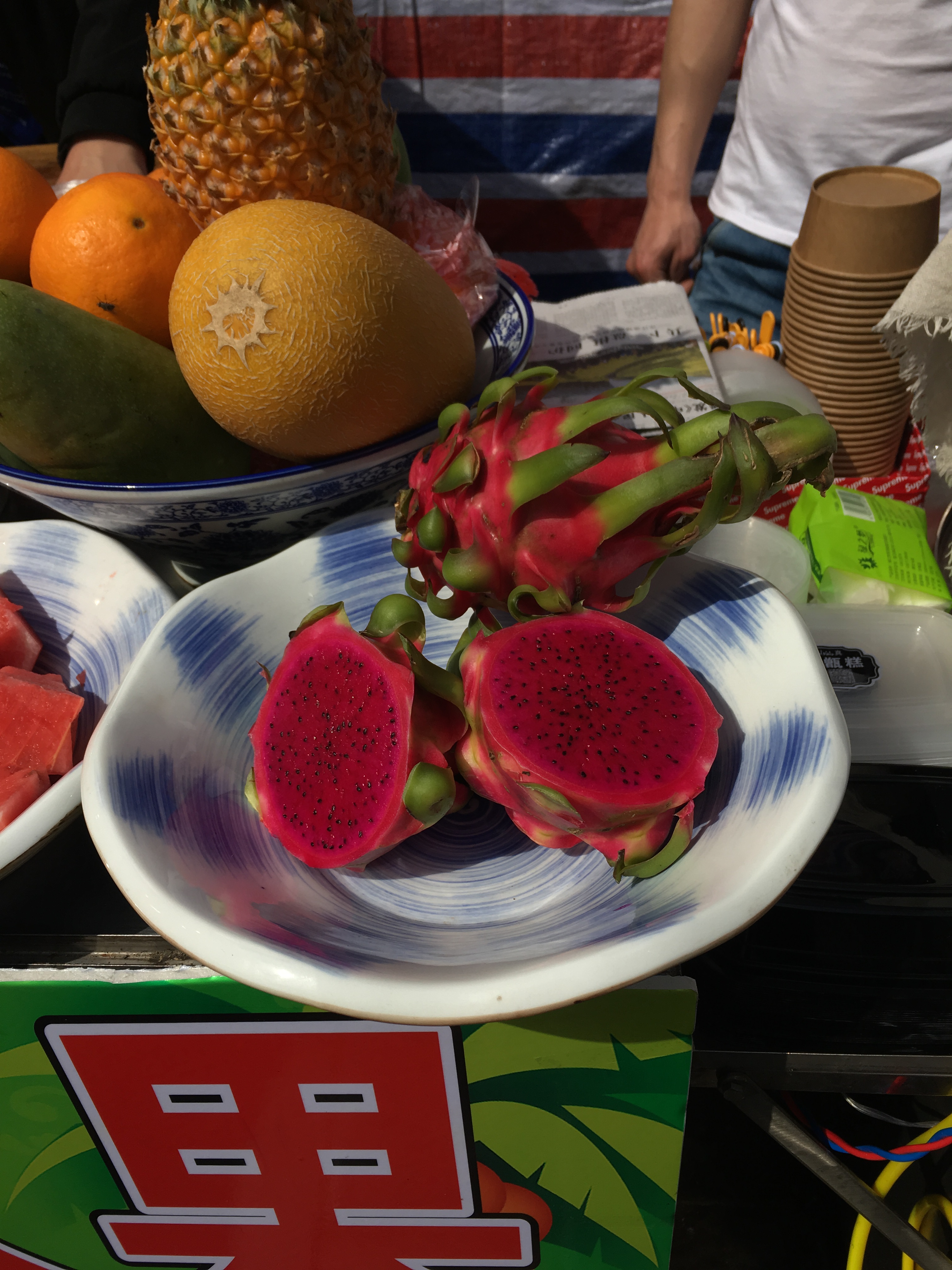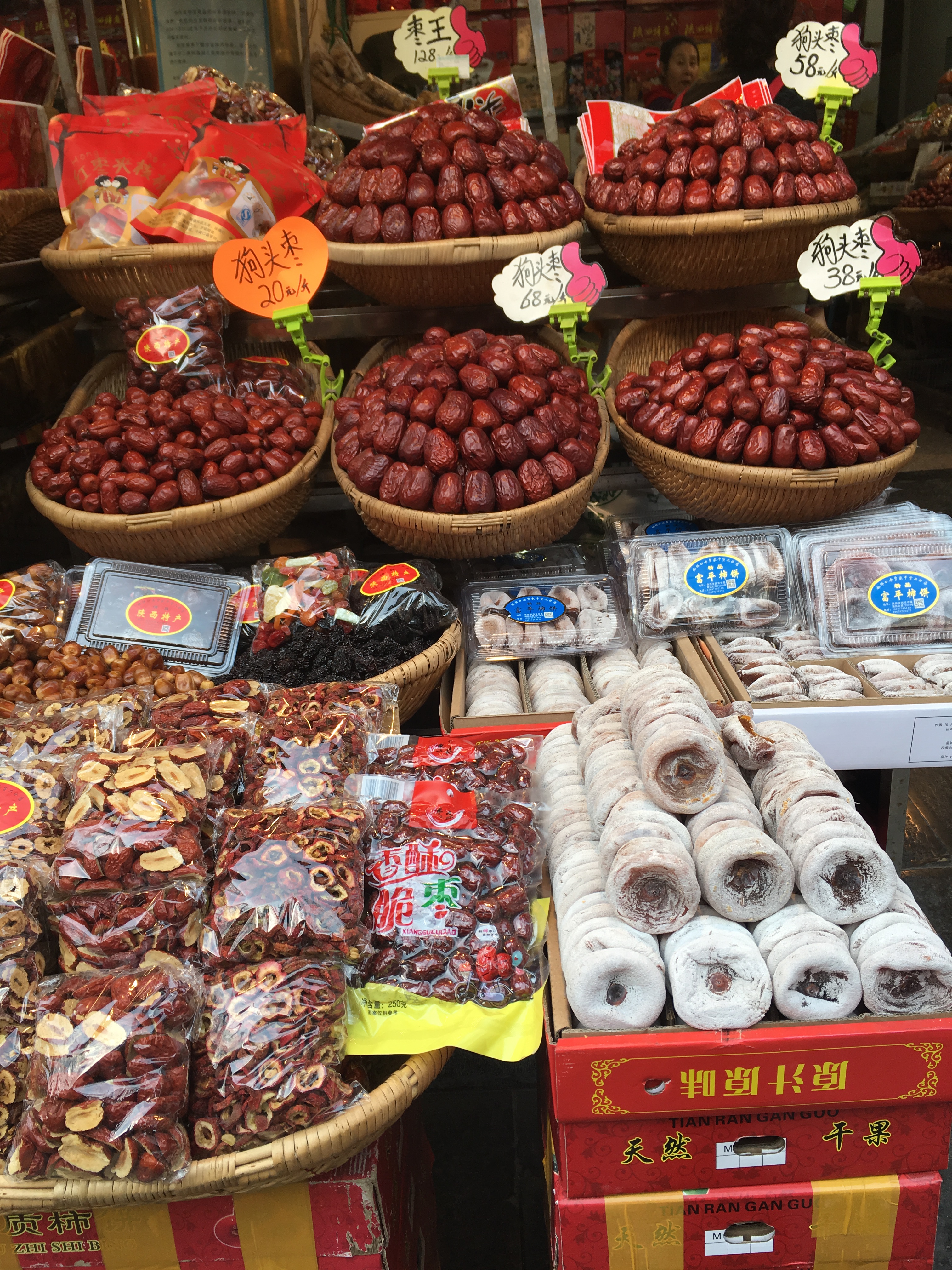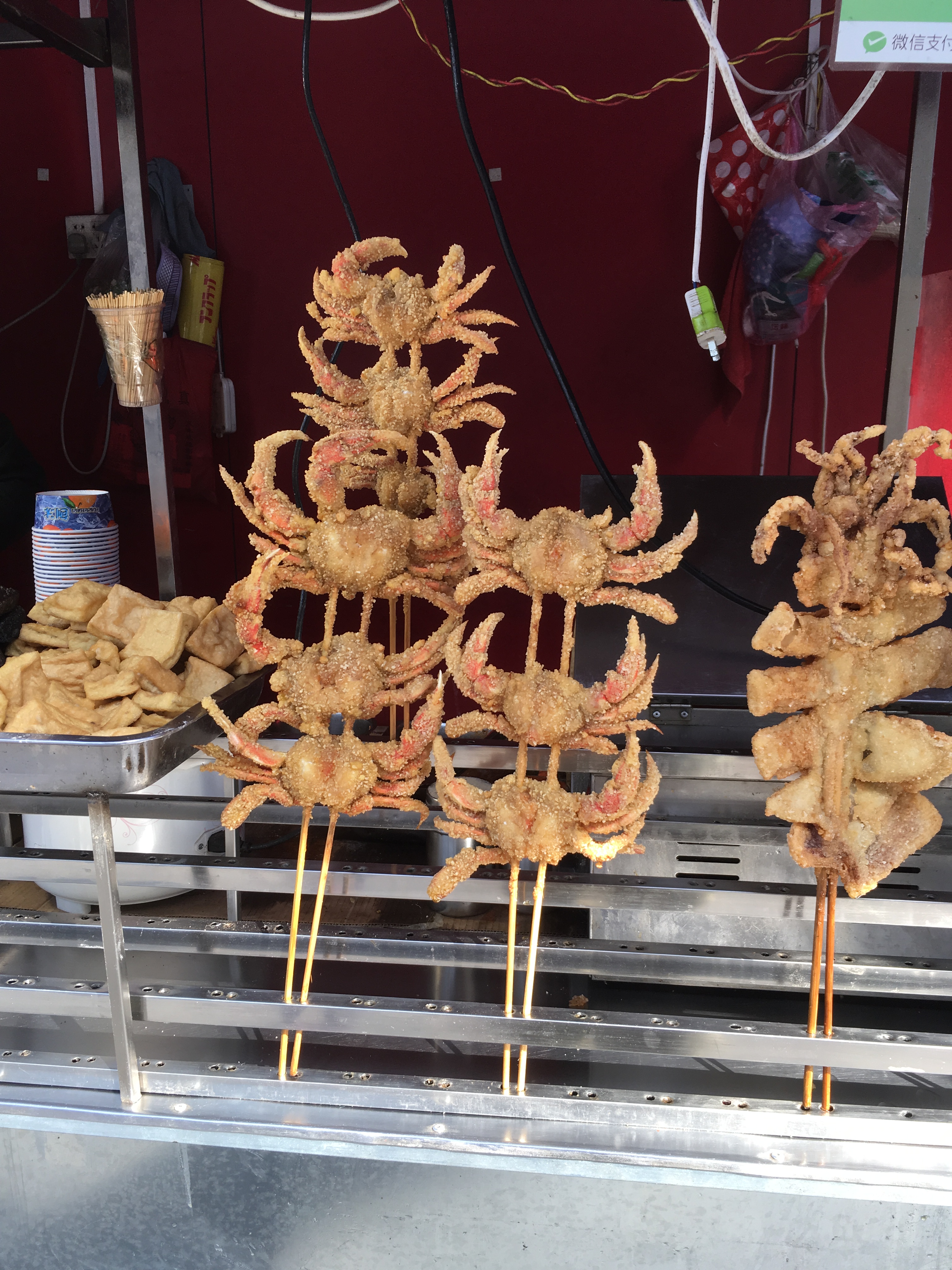 I knew the food here would be different but I had no idea how far from American food this would be. I have not seen one fortune cookie or an egg roll yet. Brad tried to go to Pizza Hut and get a pizza one night. It is a little tricky when the menu is in all Chinese. Pictures are our friends! The closest to a regular pizza he could find was duck. He didn’t tell us what the “pepperoni” was on the pizza until we were almost done. So we tried duck pizza. It was yummy. The haggle market also had some very unusual treats. Fried crab on a stick, fried squid on a stick and lots of nuts, dates and fruit. Dragon fruit, pomegranate, jack fruit, mangoes, agar plums, oranges, persimmon, pineapple, melons and apples round out the fruit. The vegetables I can’t even begin to name. We have determined there are many dishes with eyes. Whole fish, shrimp, and rays and Dana likes to add potatoes (eyes get it!). In the grocery store they sold whole fish on ice. I guess you just put a fish in a bag and go. We also discovered smoke ice cream. I can’t believe they don’t have this in the US. I want Brad to sell this at his Slate Stand at ALF. They are these colorful cold crunchy things that when you bite into them cold vapor comes out of your mouth like smoke or in Brad’s case he likes to try to get it to come out of his nose. This was the best!