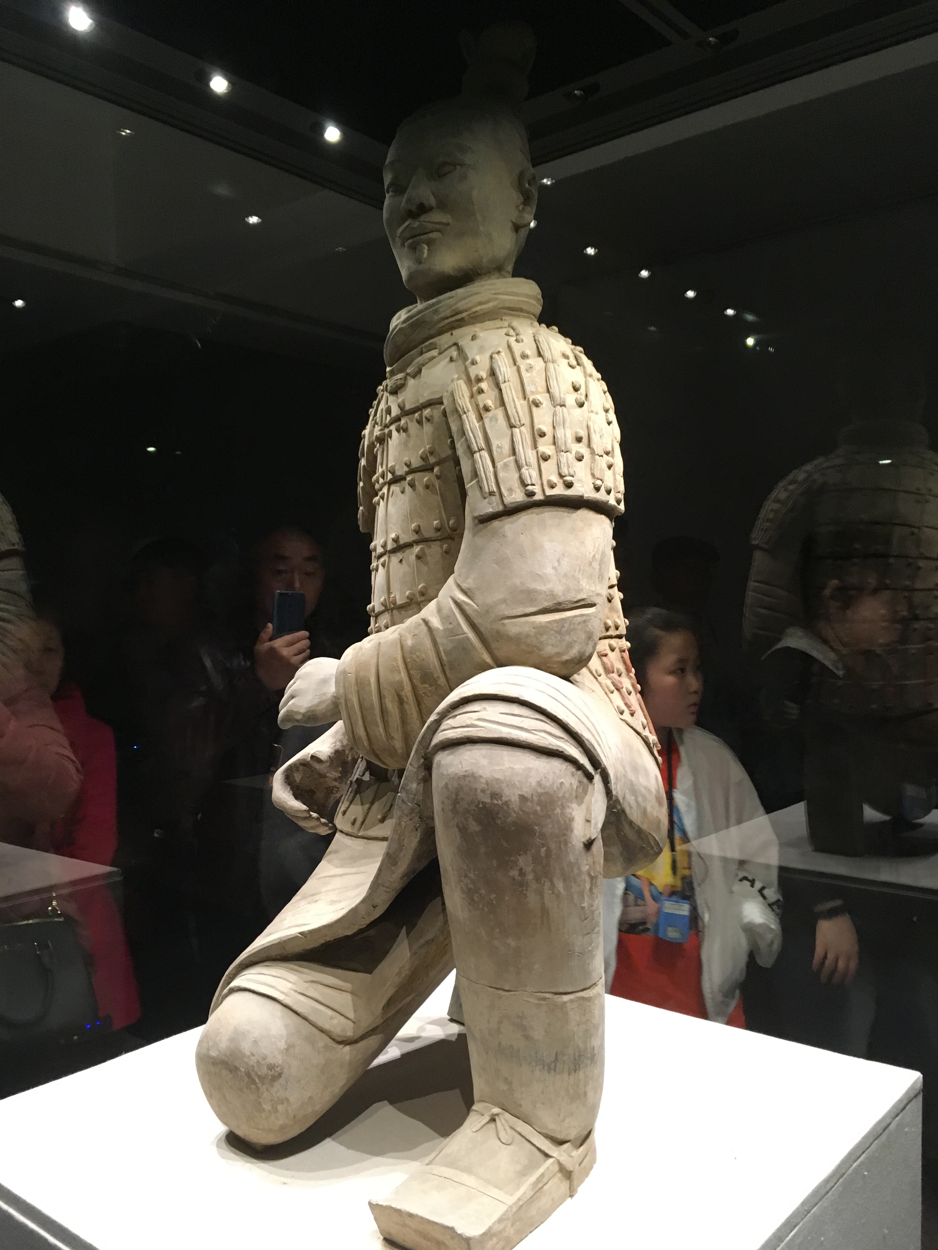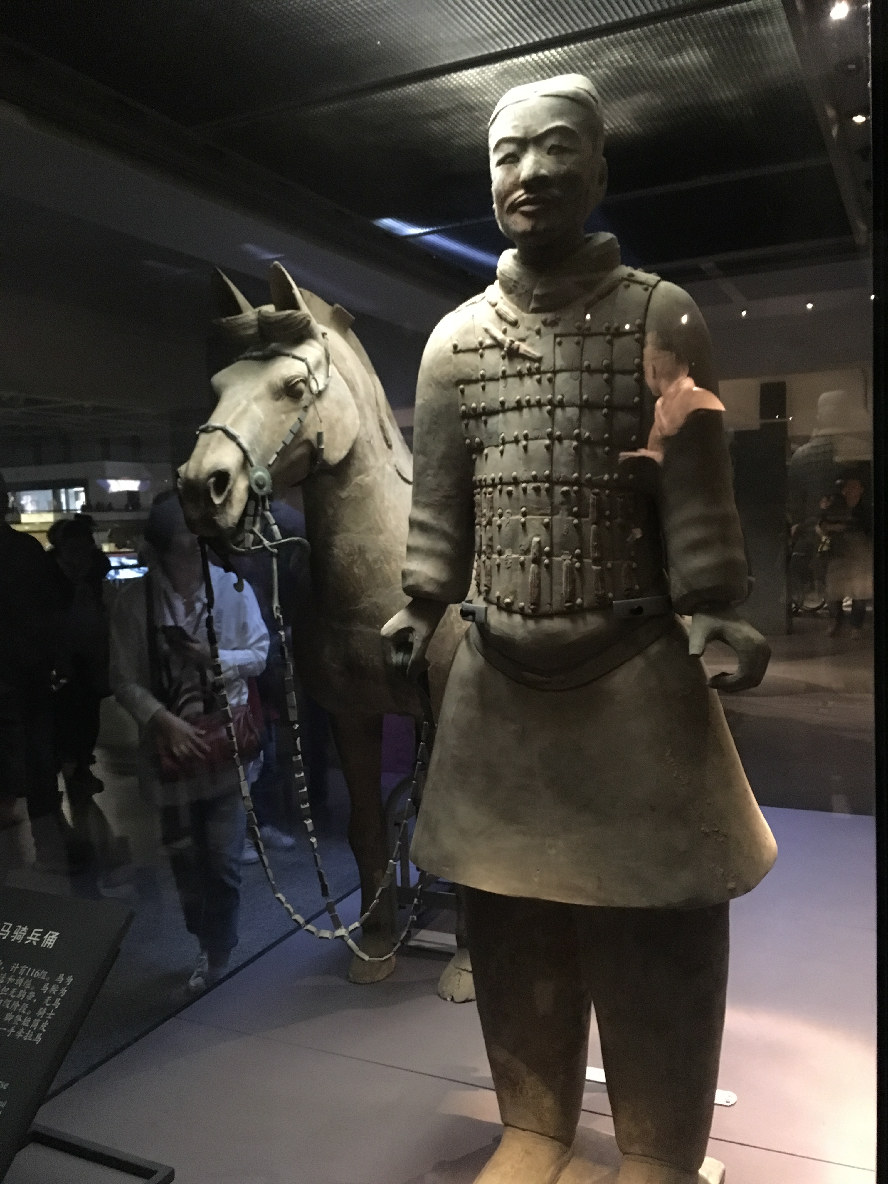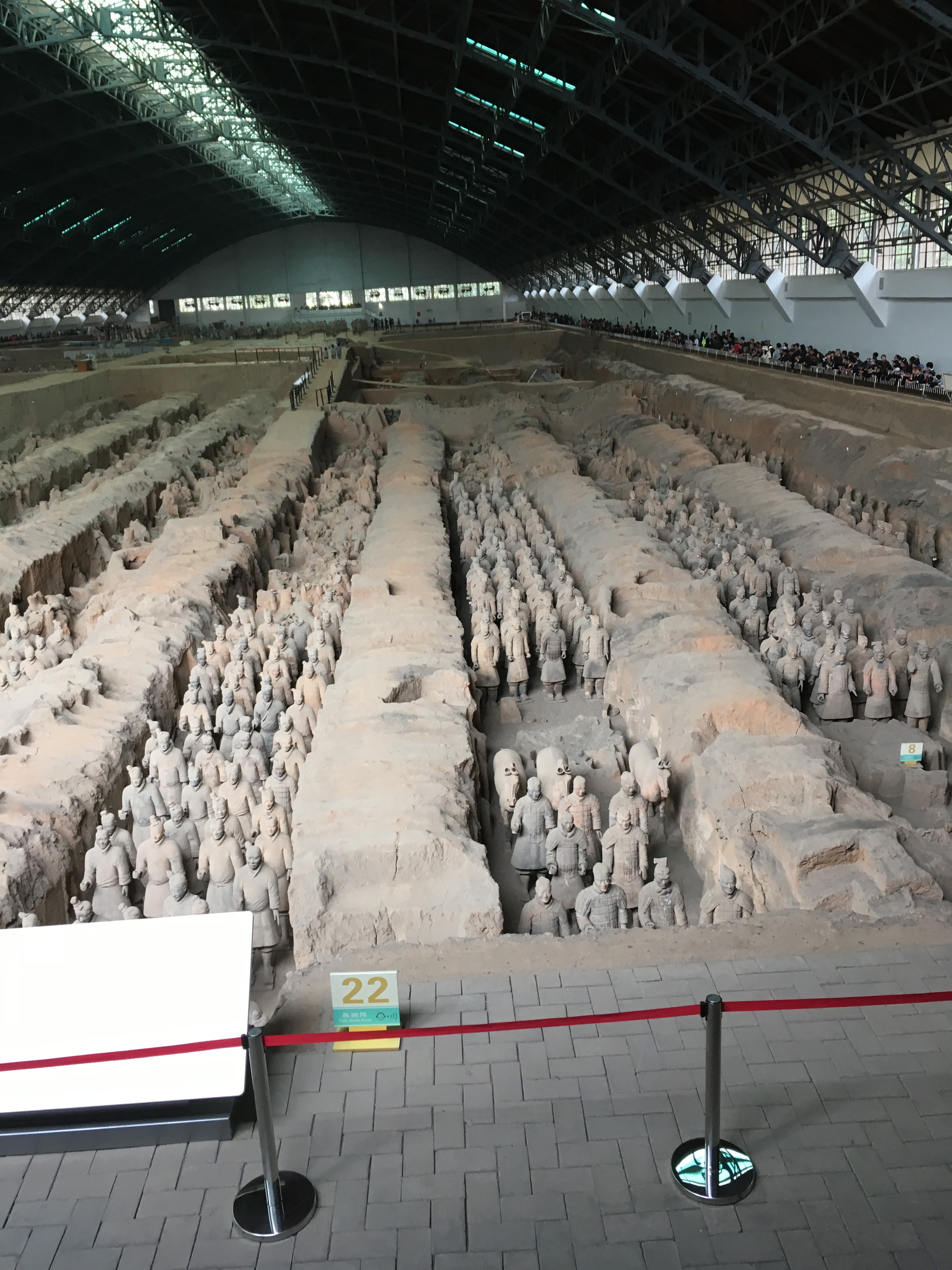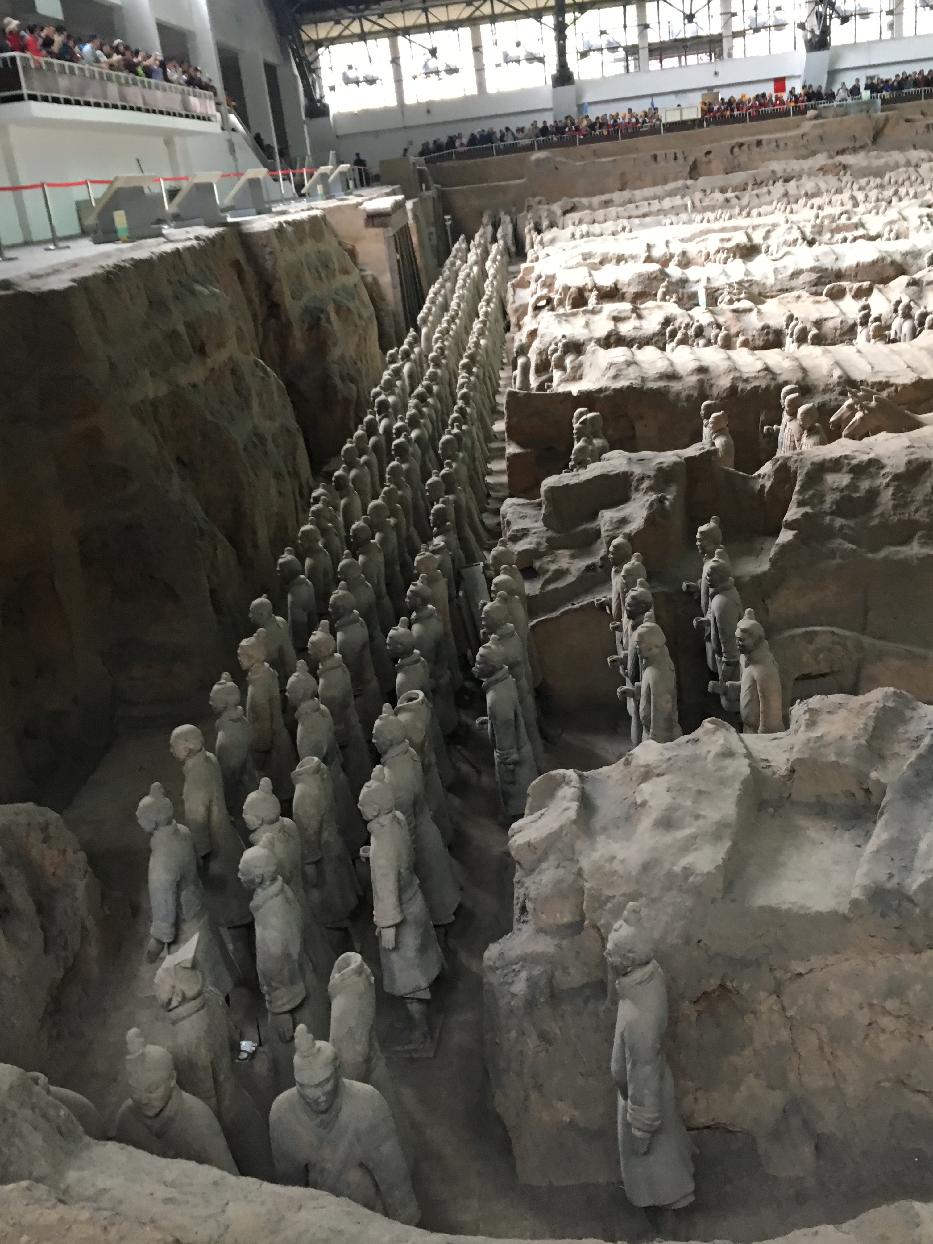 1974 a farmer discovered some terracotta pottery and ancient bronze weapons when he was digging a well. An archaeological team uncovered over 8,000 clay soldiers and horses in large pits under the ground. In 247 BC, the first Emperor of China, QinShiHuangDi ordered these life sized clay statues to be created so when he died they would be part of his burial. They think the Emperor ordered all of this to be started when he was only 13 years old.