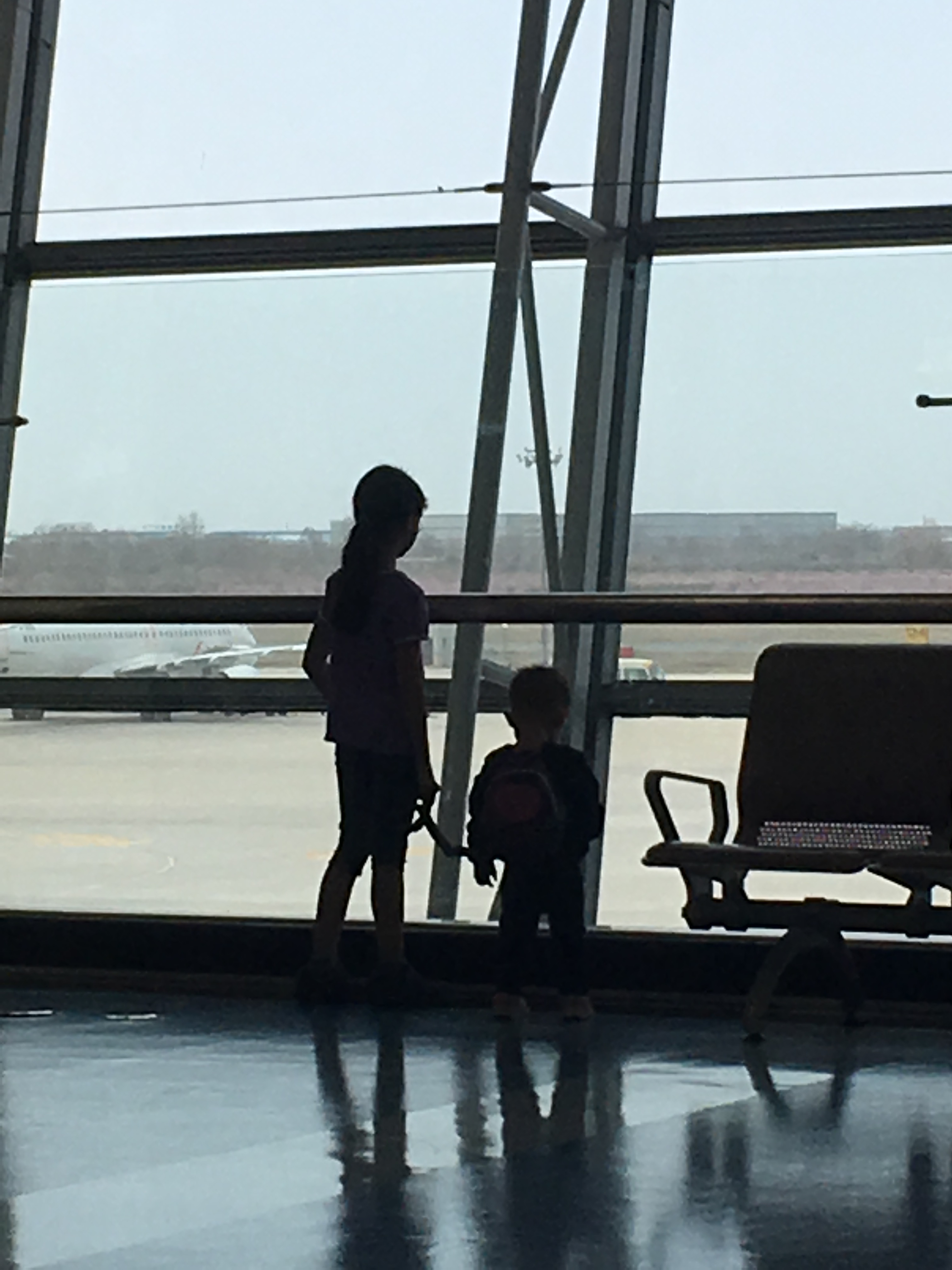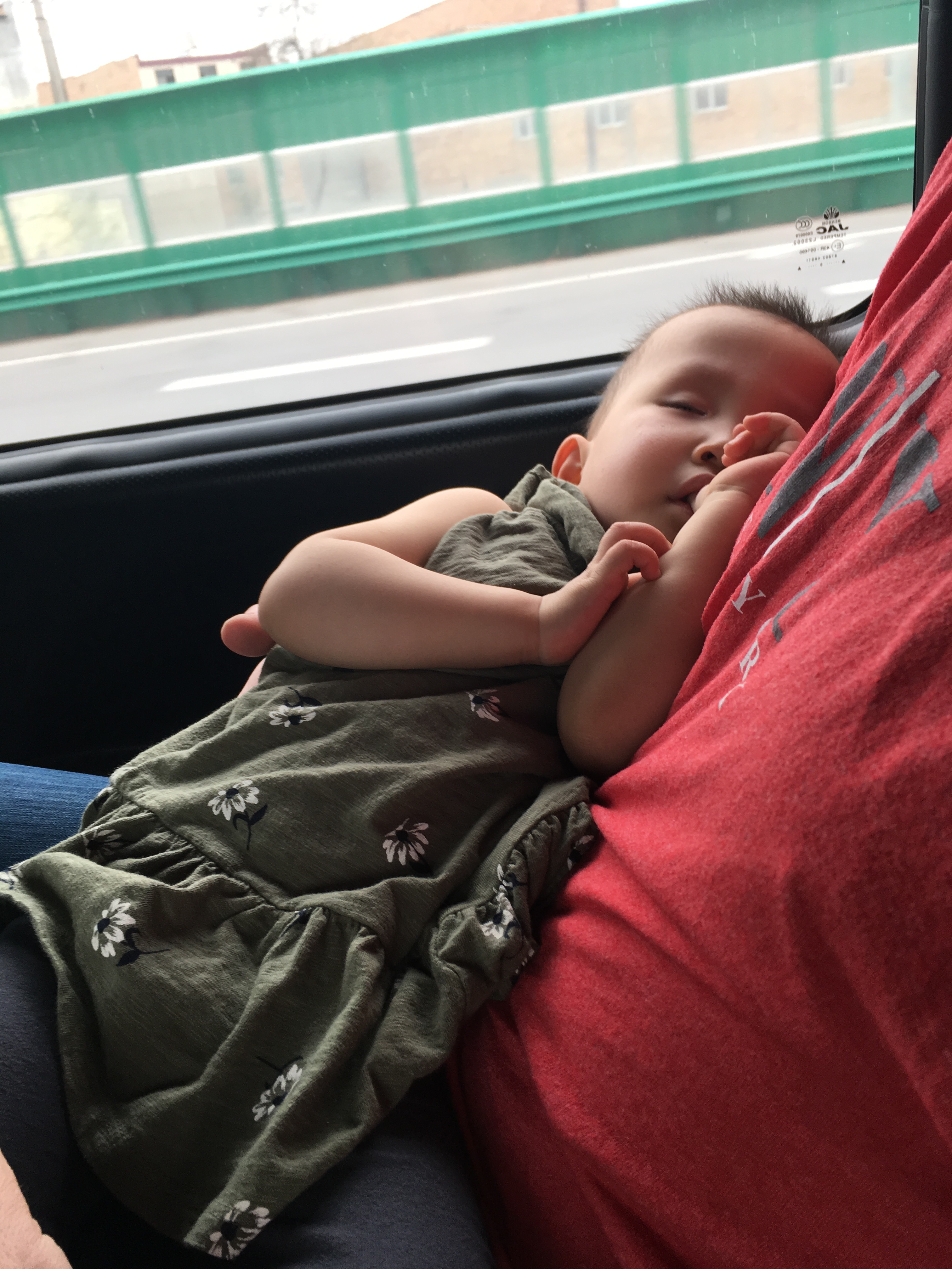 Friday was a day of travel for us. We left the hotel at noon and had to pick up passport things for Nora before heading to the airport. Our flight was delayed two hours and it was stormy so we were told to stay buckled the entire flight. The turbulence wasn’t too bad and Nora did a great job being buckled in her seat for the 2 and 1/2 hour flight. She only threw one fit and cried on the landing. Which I thought was a win since she was never on an airplane or buckled in before. A friend from Alaska told me (who flies with her little ones) just find a little thing to entertain them for the next 30 seconds and then repeat. 🙂 And fortunately for us Nora has not had many experiences so any little thing amuses here. I think she played with a couple wipes and a paper cup for 20 minutes! We looked through all the flight magazines and emergency evacuation cards. She ate lots of snacks and colored with crayons for the first time.